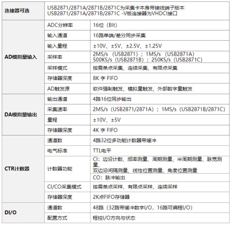 USB2871(A/B/C)系列采集卡是本公司推出的一款多功能數(shù)據(jù)采集卡。該系列板卡最高提供16路單端或差分模擬量輸入,16bit分辨率,靈活的通道轉(zhuǎn)換量程,同時用戶可通過多卡級連的方式擴展通道數(shù)量;提供4路或2路模擬量同步輸出,16bit分辨率;支持32路或8路帶緩沖數(shù)字IO,以及16路可編程IO:并且提供了4通道多功能計數(shù)器,滿足用戶的多樣化需求。